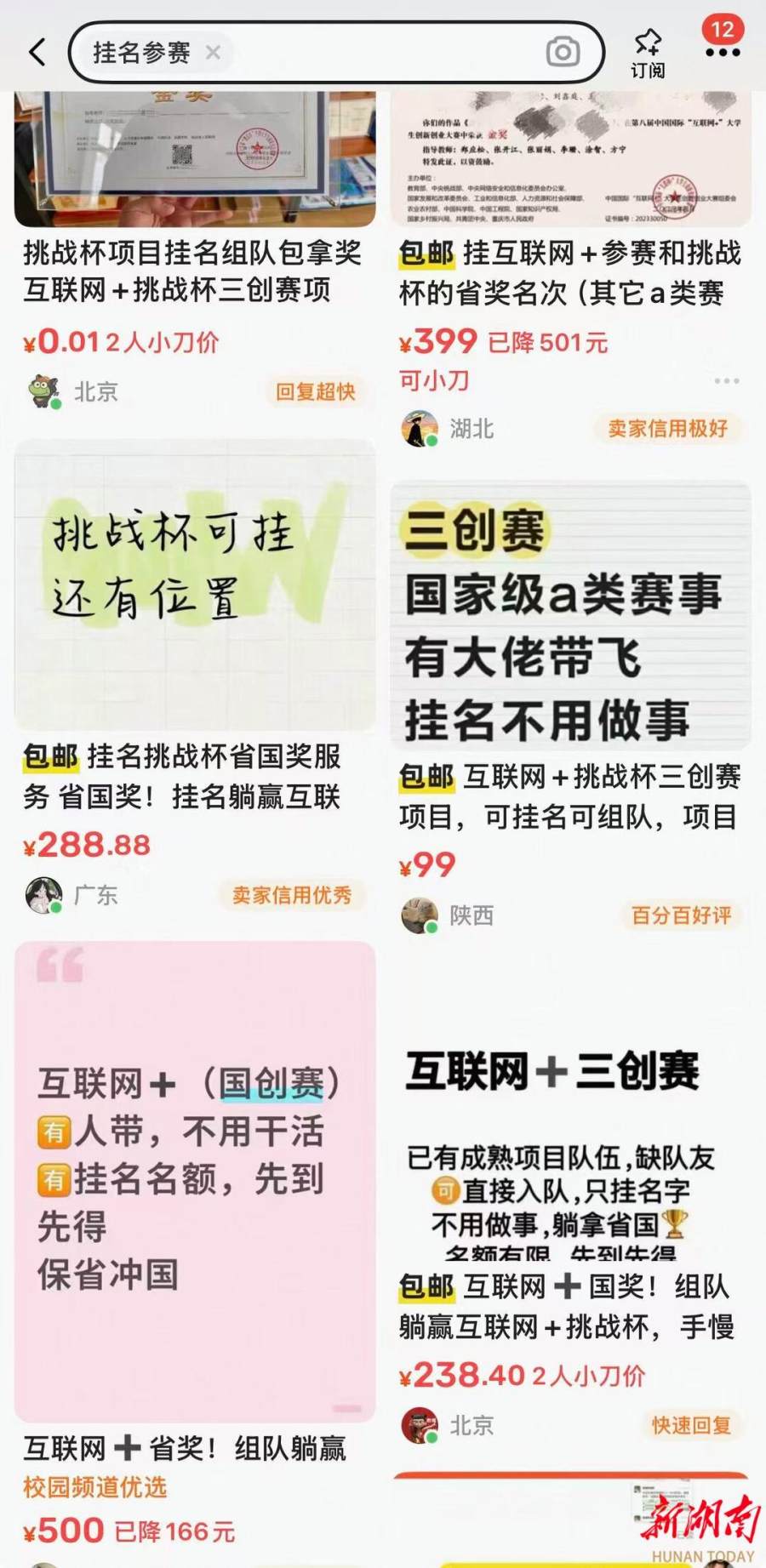 国创赛、挑战杯等国家级大学生赛事本应是公平竞技的赛场,但媒体调查发现,一些中介机构,包括在校大学生,竟然通过“挂名”和“项目整体售卖”的方式,在网上明码标价出售这些赛事奖项,帮助参赛大学生“躺拿国奖”,价格从数千元至数万元不等。有的机构还拉拢赛事评委、拿钱开路运作,甚至是一场骗局。