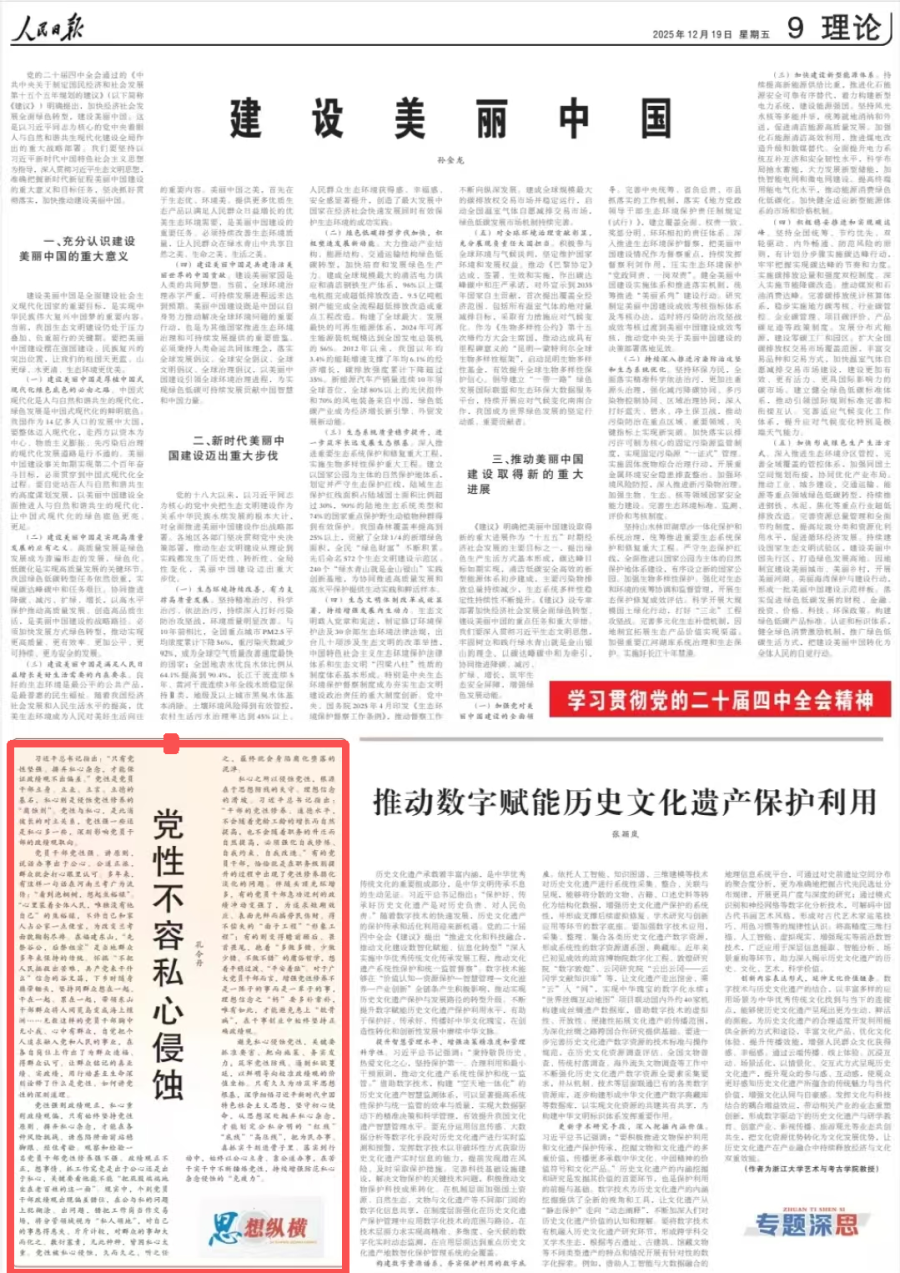 12月19日《人民日报》第9版刊发理论文章《党性不容私心侵蚀(思想纵横)》,作者孔令丹。