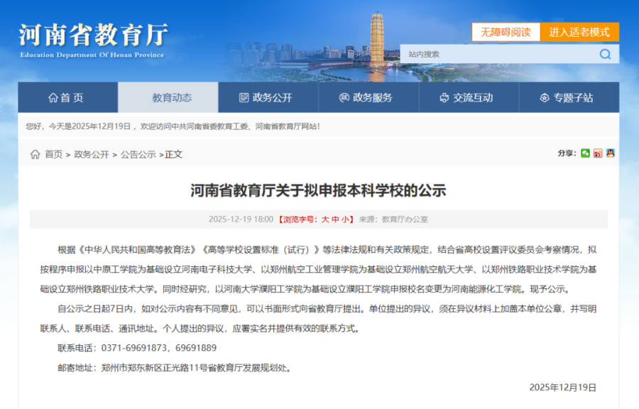 根据《中华人民共和国高等教育法》《高等学校设置标准(试行)》等法律法规和有关政策规定,结合省高校设置评议委员会考察情况,拟按程序申报以中原工学院为基础设立河南电子科技大学、以郑州航空工业管理学院为基础设立郑州航空航天大学、以郑州铁路职业技术学院为基础设立郑州铁路职业技术大学。同时经研究,以河南大学濮阳工学院为基础设立濮阳工学院申报校名变更为河南能源化工学院。现予公示。