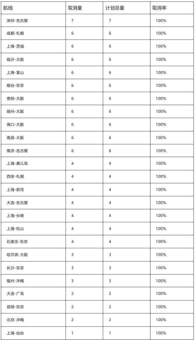 航班管家最新统计显示,2026年1月中国大陆往返日本航班取消量已达2195班次,整体取消率40.4%;其中46条中日航线在未来两周(2025年12月23日—2026年1月5日)内计划航班全部取消,取消率100%,涉及中日双方共38座机场。