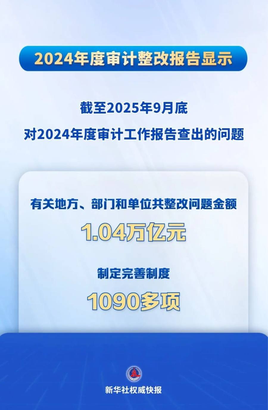 报告显示,截至2025年9月底,2024年度审计工作报告要求立行立改的2186个问题中,98%已完成整改;要求分阶段整改的1299个、持续整改的753个问题,制定了时间表和路线图。有关地方、部门和单位共整改问题金额1.04万亿元,制定完善制度1090多项,处理处分3420多人。重大问题整改总体进展顺利,解决了一些不利于经济高质量发展的体制机制问题。