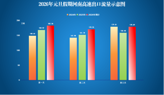 综合假期天气、收费政策等因素,预计今年元旦假期,我省高速公路出口总流量将持续回升,预计达530万辆左右,日均约177万辆,为日常流量的1.12倍。