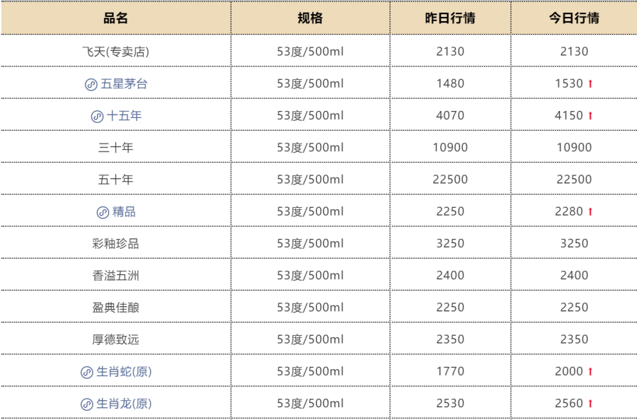 此外非标产品涨幅显著,散花飞天报2480元/瓶,较上一日涨100元;茅台十五年报4150元/瓶,较上一日涨80元;精品茅台报2280元/瓶,较上一日涨30元;生肖蛇原箱报2000元/瓶,较上一日涨230元;彩釉珍品报3250元/瓶,与上一日持平。其中,生肖蛇原箱批价单日涨230元,茅台十五年两日涨300元,涨幅尤为明显。