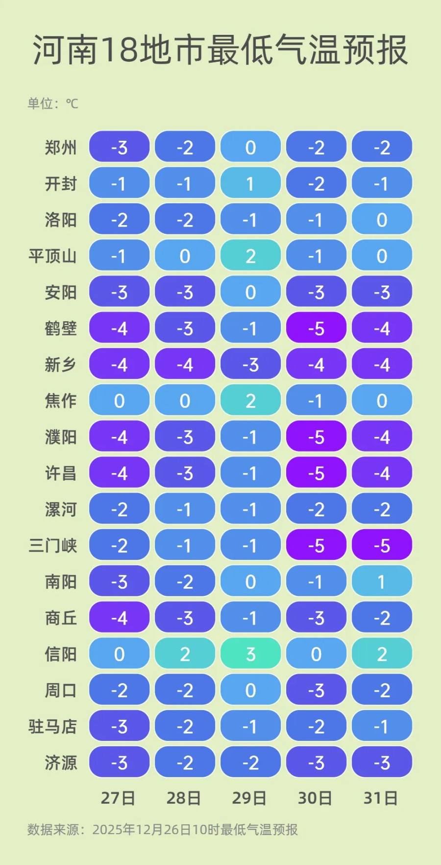 然而随着新一股冷空气扩散南下,29日全省大部最高气温降幅3-6度,午后气温9-11度。同时早晚依旧寒意在线,未来五天最低气温多在零下4度到零度,仍要注意防寒保暖。