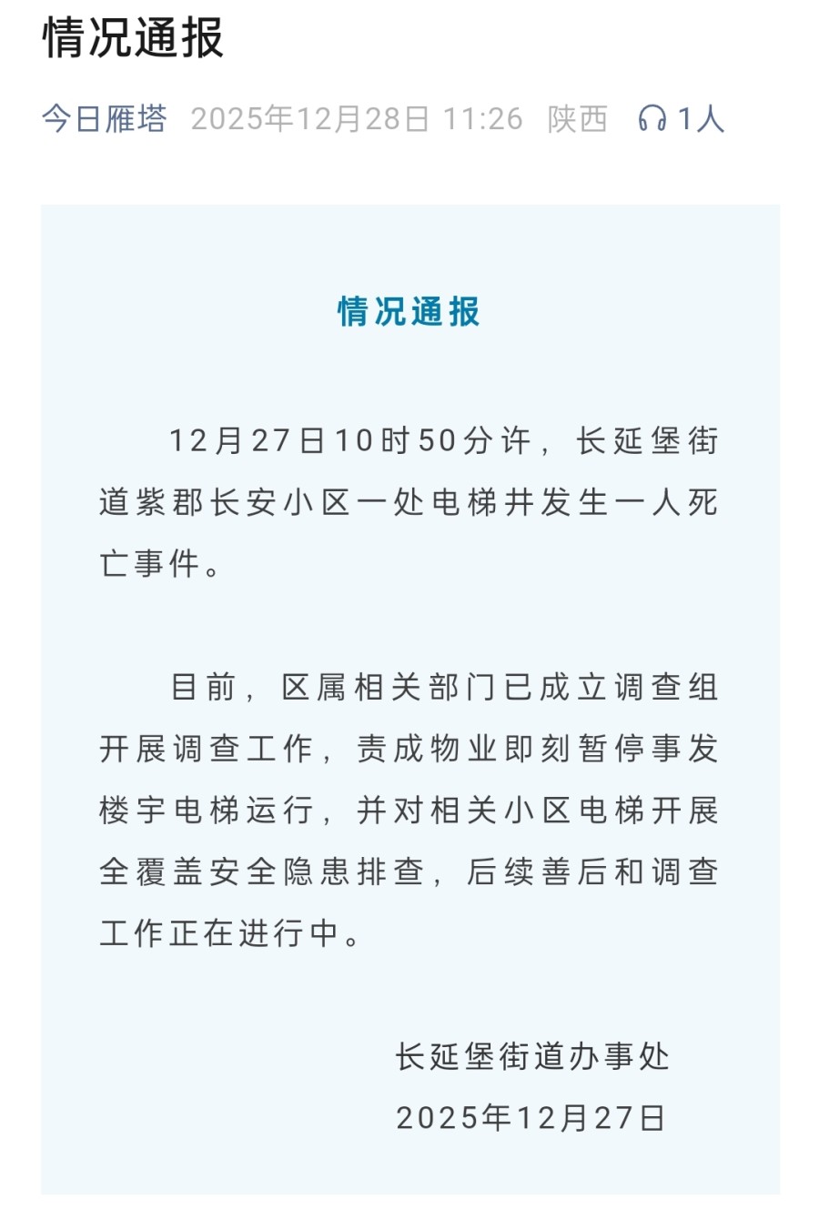 12月28日,西安雁塔通报一小区电梯井发生一人死亡事件,已成立调查组开展调查工作,详情如下: