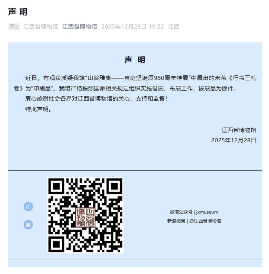 28日,江西省博物馆微信公众号发布声明,全文如下: