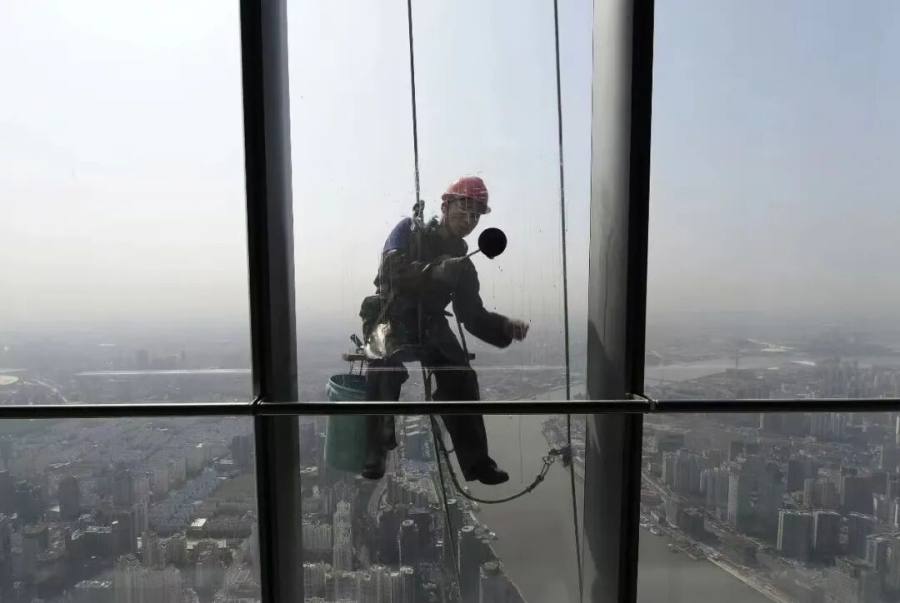 一名工人在清洗上海中心大厦的玻璃幕墙。(赖鑫琳/图)