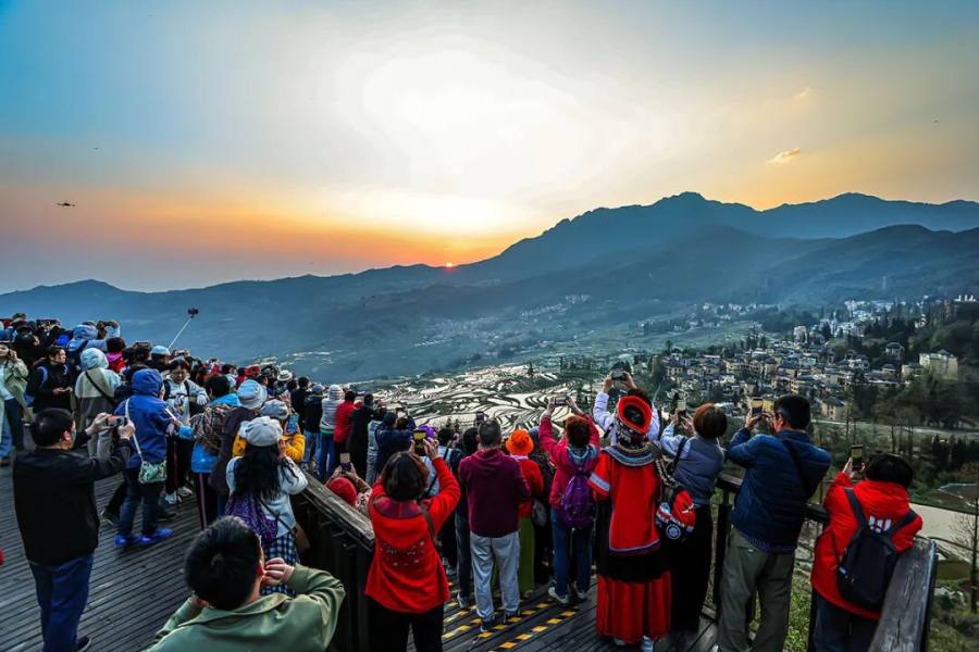 2025年3月4日清晨,云南红河州元阳县,哈尼梯田多依树景区人声鼎沸,吸引了无数游客与摄影爱好者。(视觉中国/图)