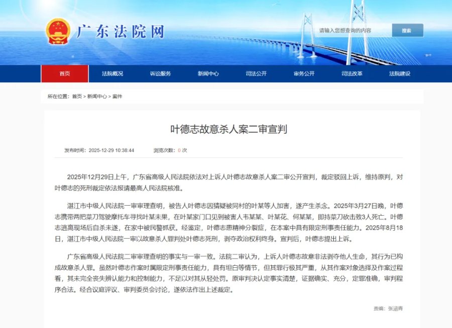 2025年12月29日上午,广东省高级人民法院依法对上诉人叶德志故意杀人案二审公开宣判,裁定驳回上诉,维持原判,对叶德志的死刑裁定依法报请最高人民法院核准。