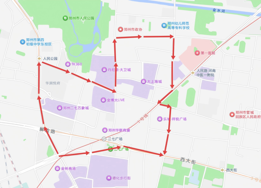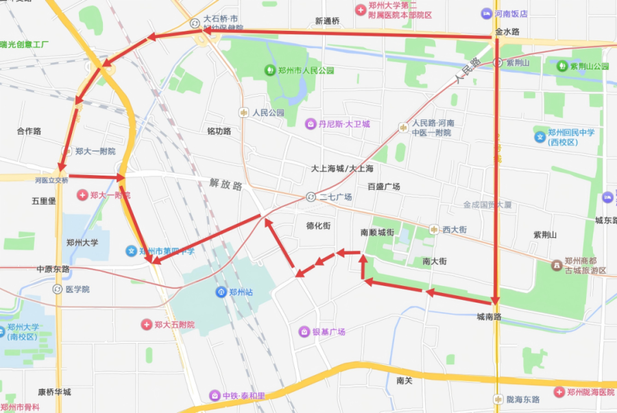 外围分流:同一时段,视情况在更大外围区域【京广快速路(不含)、河医立交(不含)、金水路(不含)以东及以南,紫荆山路(不含)以西,城南路(不含)、南顺城街(不含)、大同路(不含)、福寿街(不含)、正兴街(不含)以北的合围区域】采取远端分流措施进行分流,引导车辆绕行。