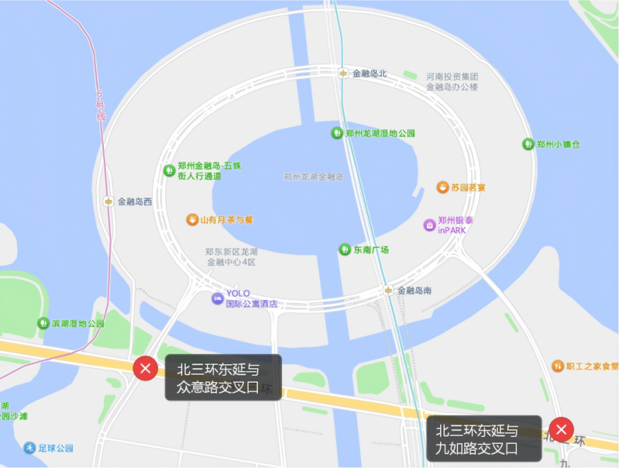 进岛通道引导:12月31日12:00起,视停车场情况,可能对北三环东延与众意路交叉口和北三环东延与九如路交叉口两处进岛通道采取车辆“只出不进”的疏导措施。