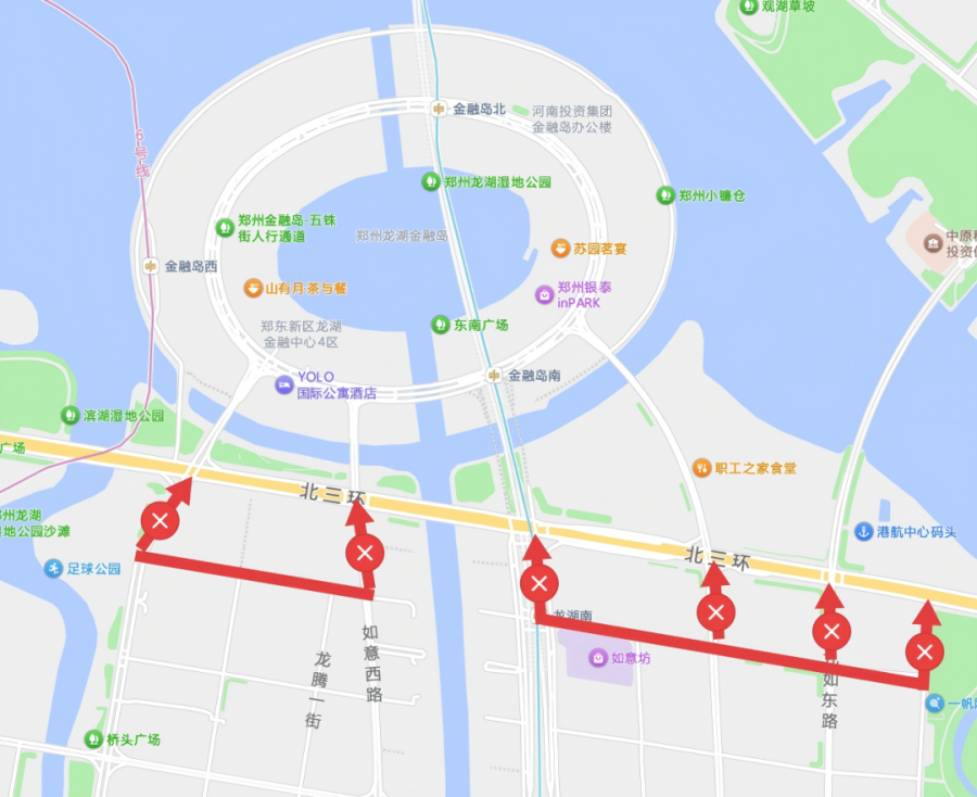 周边分流:同一时段,根据北三环东延的交通流量,适时在如意河西二街(不含,众意路至如意西路段)、如意河东二街(不含,如意东路至龙翔二街段)和龙湖内环南路(不含,北三环至众意西路段)、朝阳路(不含,众意西路至中州大道段)梯次采取分流措施,不允许车辆向北三环东延方向行驶。