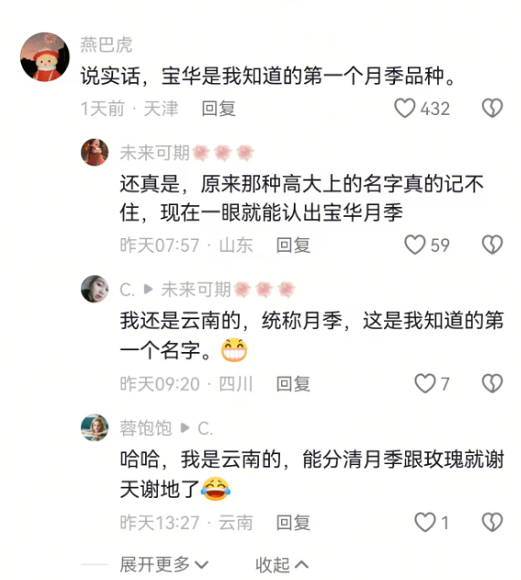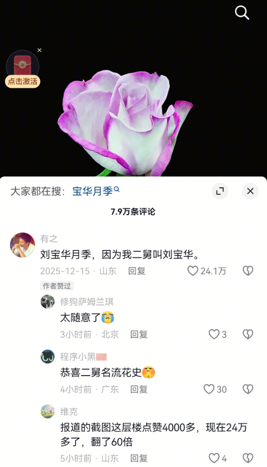 12月15日,山东网友康先生回复:用他二舅刘宝华的名字来为这朵新月季命名。对此,作者说:“我很尊重你对二舅的感情,但用作花名是不是有点牵强了。”康先生回应称:“还好,不算牵强,他长得像花一样。”