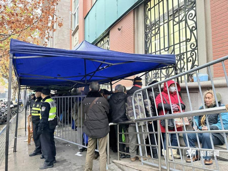 冷风里,77岁的冯大爷裹着厚外套,坐在门口的台阶上,他是今天队伍中的第一位。从前天(1月3日)晚上10点多,他就带着小凳子、粽子和一件厚衣服,在这里“安营扎寨”了。