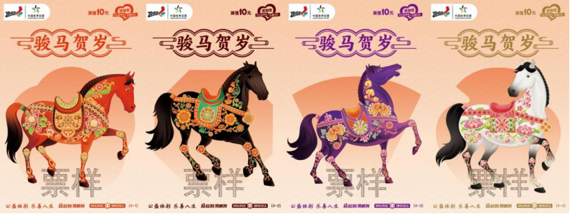 马年谁还没有这套“骏马贺岁”?“骏马贺岁”面值10元,共有4个票面场景,设计采用意象化的表现手法,搭配吉祥纹样,展现不同姿态、不同颜色的马,表达不同的吉祥寓意:“黑色”具有逆袭寓意,代表着坚持不懈的精神;“白色”代表着“以梦为马”,象征纯洁和祥瑞寓意;“紫色”代表“马到成功”,象征超凡脱俗和英勇无畏;“赤色”代表“马中赤兔”,象征热情和兴旺,具有驱邪纳福寓意。马身缀以牡丹纹、如意纹、蝙蝠纹、莲花纹等吉祥纹样,自然地给马的形象注入美好、吉祥、喜庆的内涵。这款票的刮开区设在票背,刮开覆盖膜不会破坏票面完整性,增强了这款票的收藏价值。