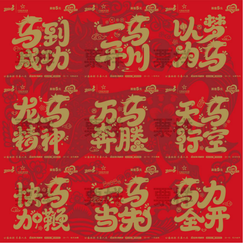 “午马”面值5元,共有9个票面场景,票面以九个经典的“马”字吉祥词语为主元素进行创意设计,例如“马到成功”“一马平川”“以梦为马”等,每个场景通过不同的剪纸艺术风格与视觉元素,传递美好祝福。今年依然采用了九联张形式展示,九张票面拼在一起可以组成一张骏马剪纸窗花图样,设计有趣,以工艺美术剪纸和创意字体融为一体,凸显传统“年味”。