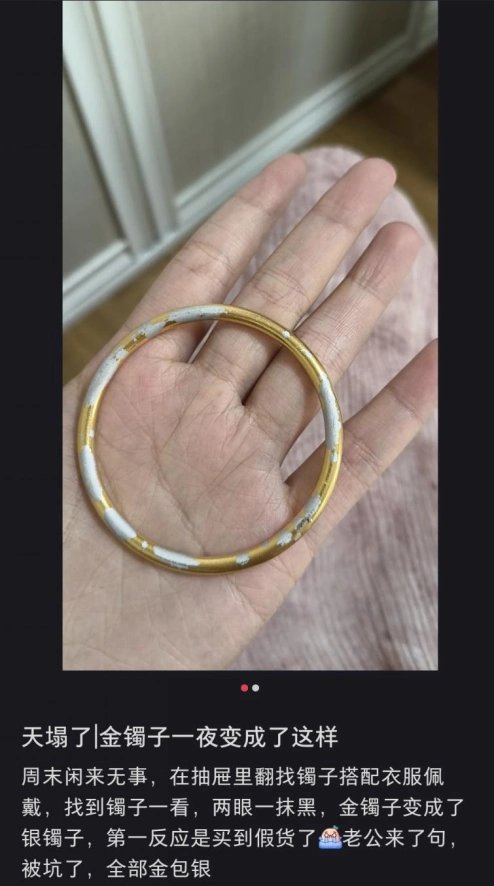 看起来厚重的金镯子,内里竟然是厚厚的银。(图/小红书截图)