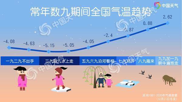 明天进入三九,也意味着一年中最寒冷的时段开启。通过1991年至2020年气象数据发现,我国大部地区最冷时段出现在三九和四九。其中三九最冷,全国平均气温仅为零下5.15℃,冷成一团。进入五九以后,全国气温呈现回升趋势,尤其是六九以后,南方不少地方回暖明显,可以沿河看到杨柳吐绿。
