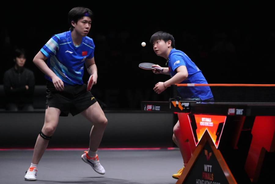 2025年12月13日,王楚钦/孙颖莎(右)在2025年世界乒乓球职业大联盟(WTT)总决赛混双决赛中。新华社发(吕小炜 摄)