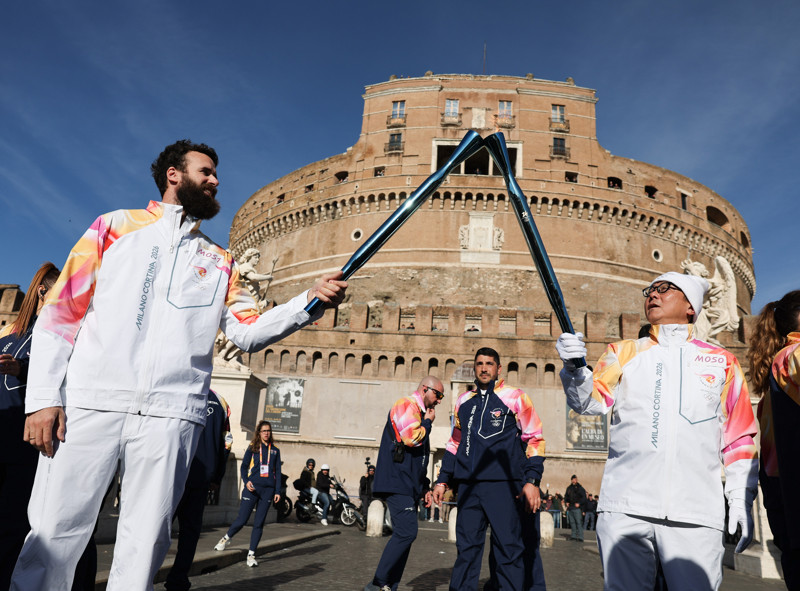 新华社照片,罗马,2025年12月6日,在意大利罗马圣天使堡,火炬手、意大利篮球运动员路易吉·达托梅(左)与火炬手槙英俊在交接火炬。当日,2026年米兰-科尔蒂纳冬奥会火炬在意大利罗马传递。新华社记者 李京 摄