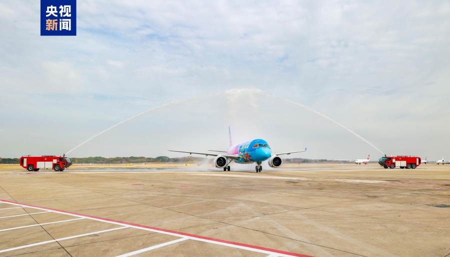 记者从中国南方航空了解到,1月12日,国产大飞机C919首次执飞广州往返南京航线,首航航班选用国内首架C919十五运会彩绘飞机“大美湾区”号执飞。飞机当天平稳降落在南京禄口国际机场后,缓缓穿过象征民航最高礼仪的“水门”。这标志着国产大飞机C919的航线网络进一步加密。