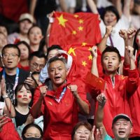 2024年8月9日,中国乒乓球队教练秦志戬(中左)等为樊振东加油。当日,在巴黎奥运会乒乓球男团金牌赛中,中国队战胜瑞典队,获得冠军。新华社记者 王东震 摄