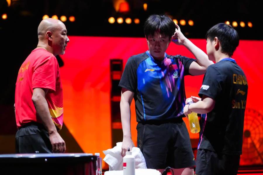 2025年12月12日,中国队教练肖战(左)在比赛暂停时指导王楚钦(中)/孙颖莎。当日,在香港进行的2025年世界乒乓球职业大联盟(WTT)总决赛混双小组赛中,中国组合王楚钦/孙颖莎3比2战胜中国香港组合黄镇廷/杜凯琹。新华社记者 朱炜 摄
