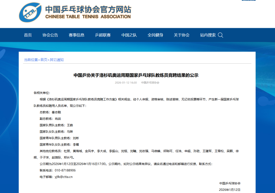 中国乒协官网12日公示洛杉矶奥运周期国家乒乓球队教练员竞聘结果,拟聘秦志戬为总教练、肖战为副总教练。