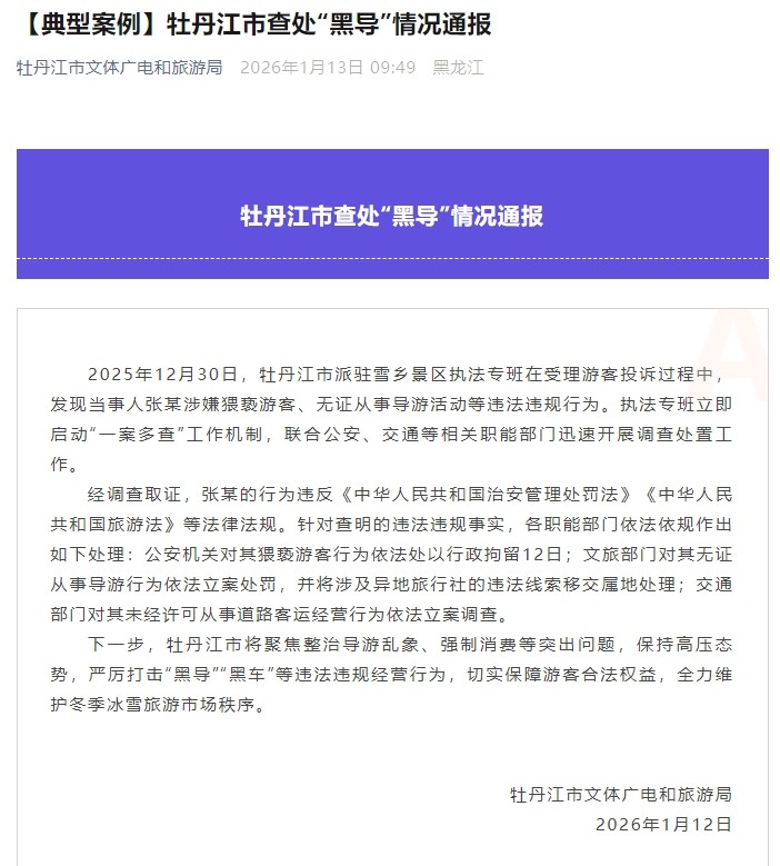 1月13日,黑龙江牡丹江市文体广电和旅游局发布情况通报,内容如下: