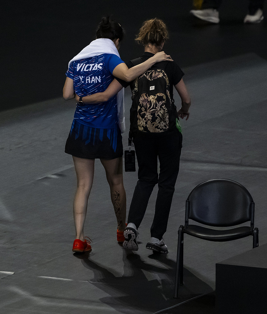 当地时间2024年1月11日,2024WTT多哈球星挑战赛女单1/16决赛,韩莹因跟腱断裂退赛。视觉中国 图