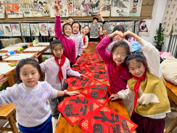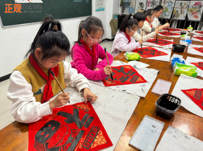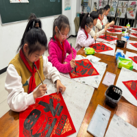 孩子们兴致盎然地手持毛笔,在红纸上认真临摹,一笔一划勾勒福字。有的孩子反复练习起笔收锋,力求笔法精准;有的孩子大胆尝试不同字体的福字写法,展现创意巧思。尽管笔法尚显稚嫩,每一幅作品却都饱含对新春的美好期许。一张张红底黑字的福字陆续完成,成为孩子们送给自己和家人最真挚的新春礼物。
