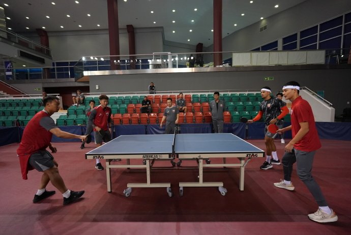 海港队通过乒乓球交流赛让队员得到调节放松。