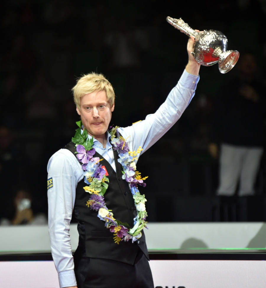 2025年3月9日,尼尔·罗伯逊在颁奖仪式上庆祝。当日,在2025年斯诺克世界大奖赛决赛中,澳大利亚选手尼尔·罗伯逊10比0战胜英格兰选手斯图亚特·宾汉姆,夺得冠军。新华社发(卢炳辉 摄)