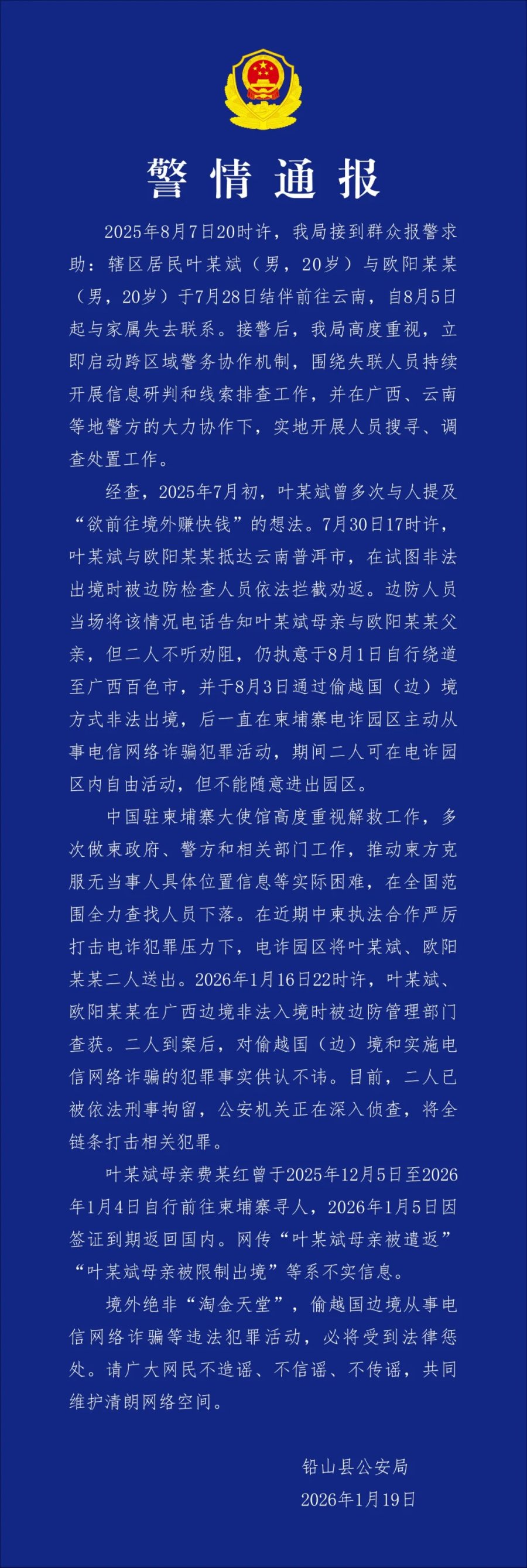 中国驻柬埔寨大使馆高度重视解救工作,多次做柬政府、警方和相关部门工作,推动柬方克服无当事人具体位置信息等实际困难,在全国范围全力查找人员下落。在近期中柬执法合作严厉打击电诈犯罪压力下,电诈园区将叶某斌、欧阳某某二人送出。2026年1月16日22时许,叶某斌、欧阳某某在广西边境非法入境时被边防管理部门查获。二人到案后,对偷越国(边)境和实施电信网络诈骗的犯罪事实供认不讳。目前,二人已被依法刑事拘留,公安机关正在深入侦查,将全链条打击相关犯罪。