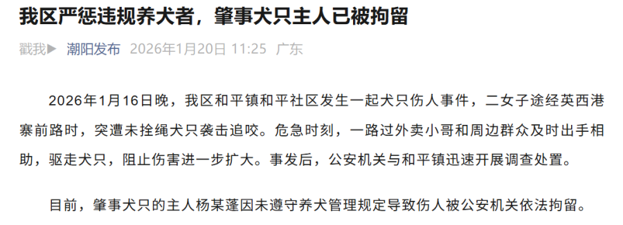 2026年1月16日晚,我区和平镇和平社区发生一起犬只伤人事件,二女子途经英西港寨前路时,突遭未拴绳犬只袭击追咬。危急时刻,一路过外卖小哥和周边群众及时出手相助,驱走犬只,阻止伤害进一步扩大。事发后,公安机关与和平镇迅速开展调查处置。