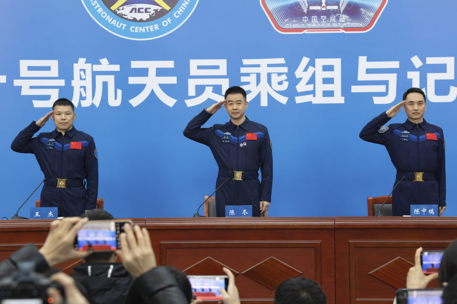1月16日下午,中国航天员科研训练中心在北京航天城举行神二十乘组与记者见面会,航天员陈冬(中)、陈中瑞(右)、王杰(左)太空归来后首次公开亮相。 新华社图