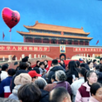 夕阳西下,天安门墙绘前依旧人头攒动。一位须发尽白的老人独自站在人群之外,远远望着墙上的画面,眼中似有光芒闪烁。