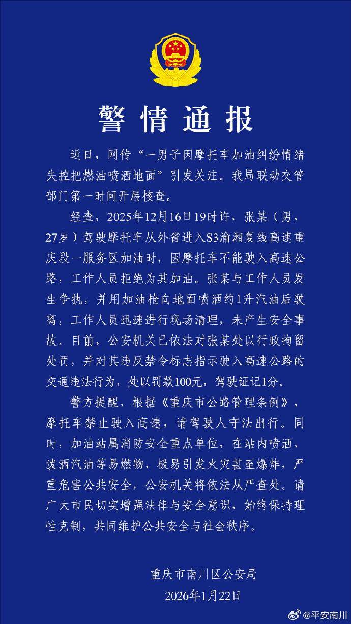 男子因摩托车加油纠纷,情绪失控把燃油喷洒地面,重庆警方:已被行拘,罚款100元