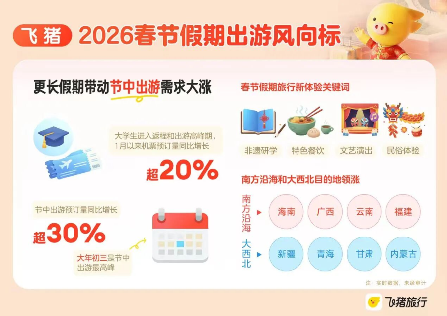 今年春节期间,5—7天的短途游产品预订仍占据主流,但部分用户将出发节点延至节中,回乡过年、外出度假“两不误”的趋势愈发明显。飞猪数据显示,截至目前,节中出行的服务预订量同比增长超30%,其中,大年初三是节中出行最高峰时段,预订量较去年提升超40%。北京、上海、广州、深圳、杭州、哈尔滨、成都、西安、福州、重庆等是节中出游的热门城市。