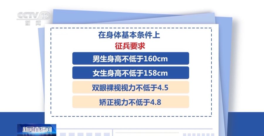 在身体基本条件上,征兵要求男生身高不低于160cm,女生不低于158cm,双眼裸视视力不低于4.5,矫正视力不低于4.8,具体标准可查询全国征兵网(http://www.gfbzb.gov.cn/)体格检查标准摘要。有意向参军入伍的大学生,需登录“全国征兵网”,如实填写相关信息报名应征。