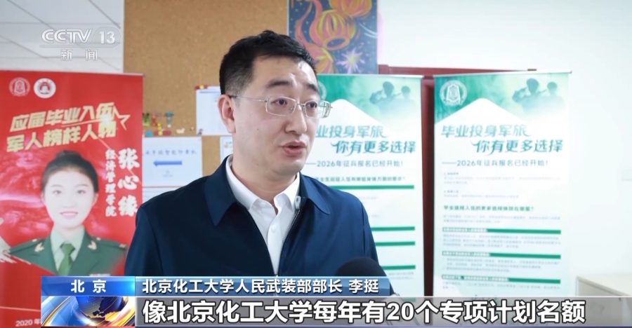 北京化工大学人民武装部部长李挺:退役学生想考研的话,像北京化工大学每年有20个专项计划名额。对于应征入伍的在校学生来说,服役回来的学生,除了特定专业之外,可以回来在全校任选专业。对于毕业生来说,我们更建议征兵入伍是一个职业选择,把自己的职业生涯规划到部队。