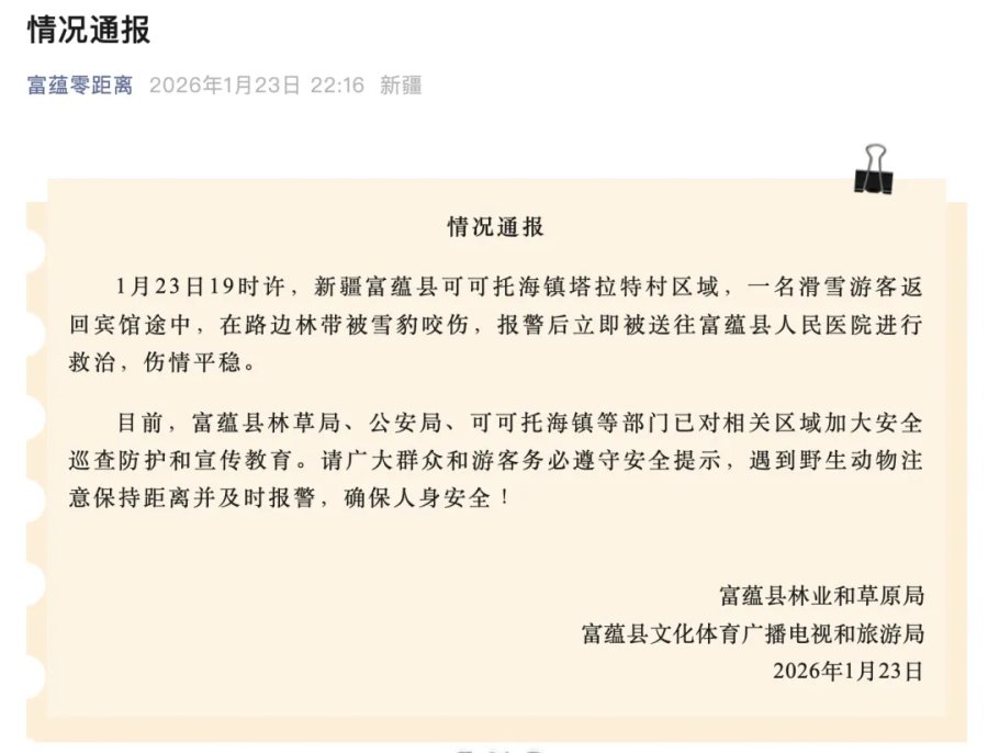 一滑雪游客被雪豹咬伤,新疆富蕴县通报