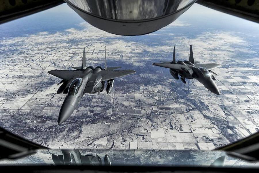 两架F-15E战斗机准备与一架KC-135R空中加油机对接,进行空中加油。另据美国《空天军杂志》本月20日消息,驻扎于英国拉肯希思皇家空军基地的美军第494战斗机中队下属12架F-15E战斗机,在空中加油机的支持下,已于1月18日调派至中东地区。