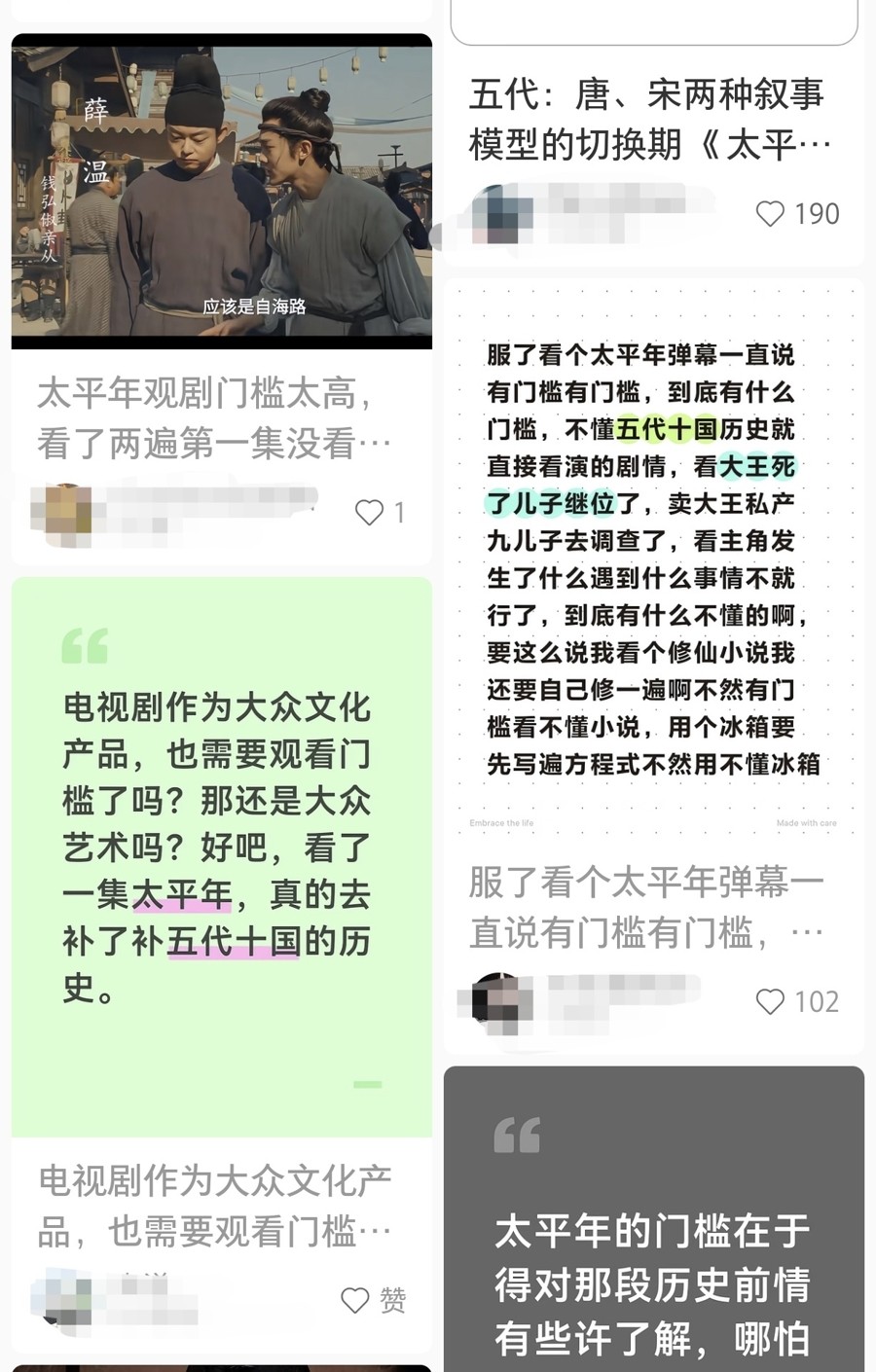 “推荐《太平年》,五代十国是我非常感兴趣的一段历史,我们的祖先是如何穿越这浓黑乱世与王朝更迭里的血腥杀戮,仁义礼智信为何未在礼崩乐坏中全面崩盘,人性之光又何以在蝼蚁般苟活的乱世缝隙中倔强闪烁,这背后藏着的,大约也是中华文明绵延不绝的密码。”《太平年》播出后,观众钱晨祎在朋友圈推荐这部剧。在她看来,因为“乱”,五代十国这段历史一般人不太感兴趣,这部剧虽然有一定观看门槛,“但也起到了历史普及的作用”。