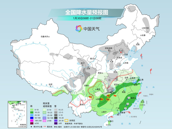 31日,降水范围将收缩至长江中下游及以南地区,湖北南部、湖南北部、安徽中南部、江苏南部、浙江北部等地雨雪混杂,湖南北部有小到中雪。