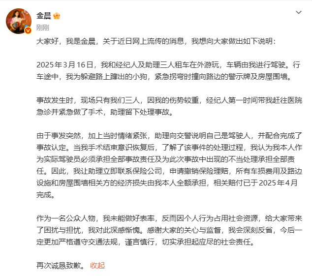警方通报演员金晨交通事故不存在骗保,金晨发文道歉