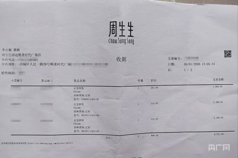 “我是今年1月5日在广东省清远市清城区远盈时代广场的周生生店购买的首饰,当时想着品牌大,品质有保障,没想到会出现这种问题。”李女士回忆说.