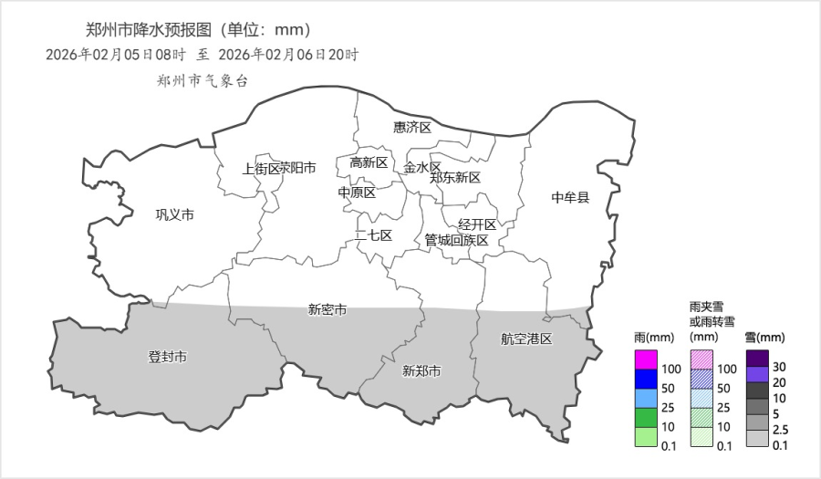 图1 2026年2月5日08时至6日20时郑州市降水量预报图