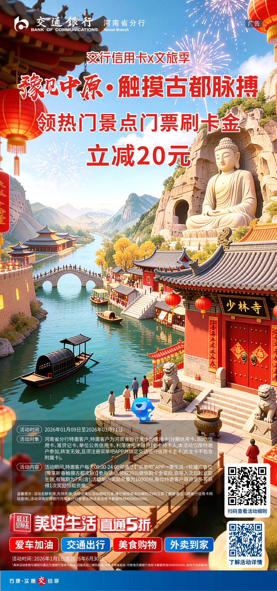2026年1月9日至3月31日,交通银行河南省分行特别推出“豫享新春·触摸古都文脉”活动,通过积极联动省内核心文旅资源,推动文旅消费升级,从而助力中原优秀传统文化传承发展。河南省分行特邀信用卡主卡持卡人通过“买单吧”APP领取专属优惠,在龙门石窟、隋唐洛阳城、清明上河园、开封龙亭、少林寺、只有河南·戏剧幻城等六大标志性景区,通过景区官方微信小程序购买景点门票单笔支付满20.01元即可享20元刷卡金抵扣,让市民和游客以更优成本领略厚重河南的历史文脉。