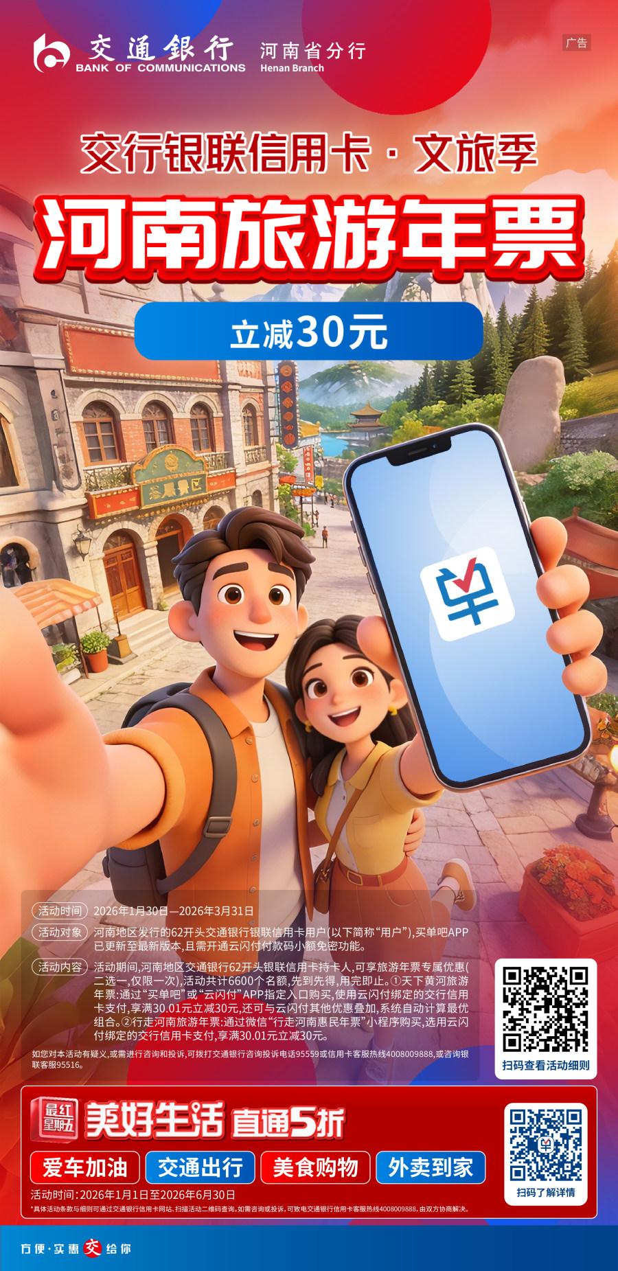 同步上线的还有旅游年票专项补贴活动。2026年1月30日至3月31日,持河南地区62开头的交行银联信用卡,通过指定渠道购买“天下黄河旅游年票”或“行走河南旅游年票”,可享满30.01元立减30元优惠,降低全年畅游门槛,鼓励居民探索家乡美景。